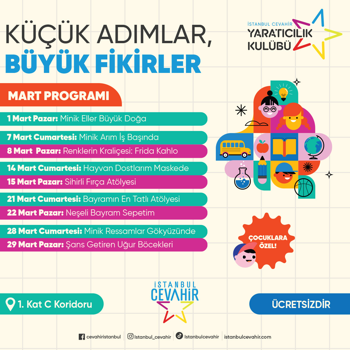 İstanbul Cevahir Alışveriş ve Eğlence Merkezi, mart ayında çocuklara yönelik dopdolu bir etkinlik takvimi sunduğunu duyurdu. Yaratıcılık Kulübü kapsamında düzenlenen atölyeler, miniklerin hayal gücünü özgürce kullanabilecekleri, üretmeyi ve keşfetmeyi deneyimleyebilecekleri bir ortam sağlayacak.
